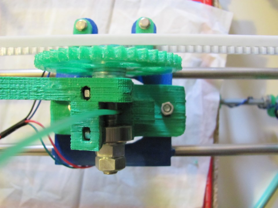 Extruder top view with plastic ← Previous Top view of the working extruder, with plastic being manually fed through.